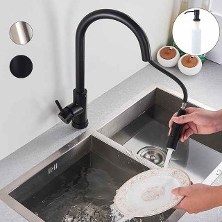 Kitchen Sink Mixer Faucet with Pull Out Sprayer, Stainless Steel Rotatable Vessel Tap, Rainfall/Waterfall Mode Spray Faucet, Black&Silver Kitchen Faucet Tap with Soap Dispenser