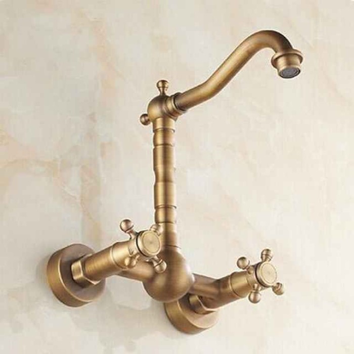 Vintage Kitchen Sink Mixer Faucet Wall Mounted, 360 Swivel Spout Retro Style Brass 2 Handle 2 Hole Vessel Taps, Traditional Kitchen Taps with Hot and Cold Water Hose