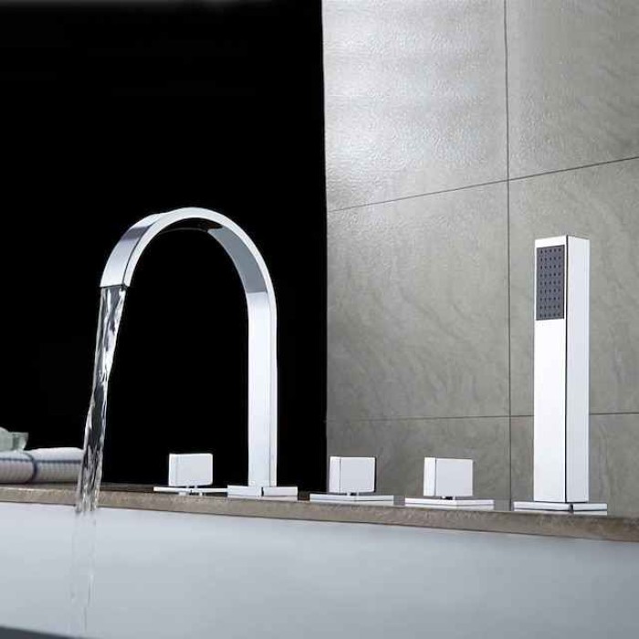 Bathtub Faucet Multi-hole Deck Mounted with Heldhand Showerhand, Bath Tub Filler Mixer Brass Taps 5 Hole 3 Handle Chrome