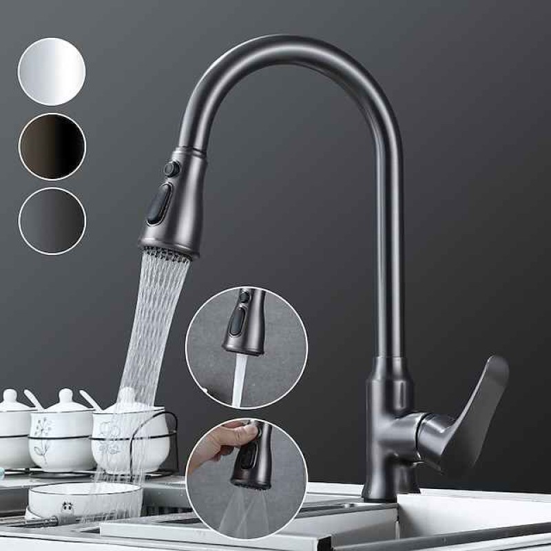 Kitchen Faucet with Pull-out Spray,Single Handle One Hole Brass High Arc 3-Modes Minimalist Style Kitchen Taps(Gun Grey/Black/Chrome)