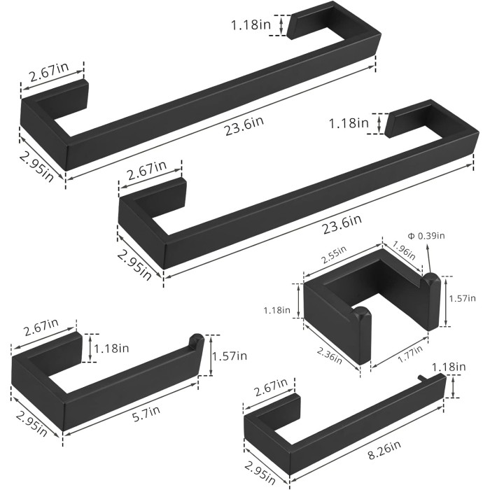 - ❥5-Piece Bathroom Accessory Kit Includes--2x 23.6‘’ wall mounted towel bar, 1x 5.7'' toilet paper holder, 1x 8.26" towel ring and 1x 2.55''double robe hook.