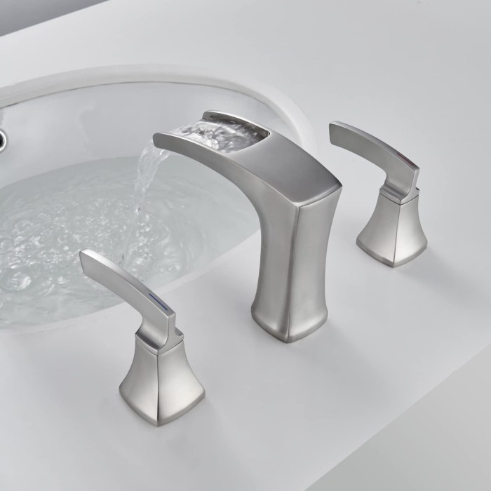 • Functional Design: Waterfall spout design for large water flow and daily use. Two lever handles make the water flow and temperature control easy.