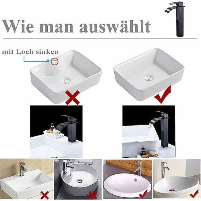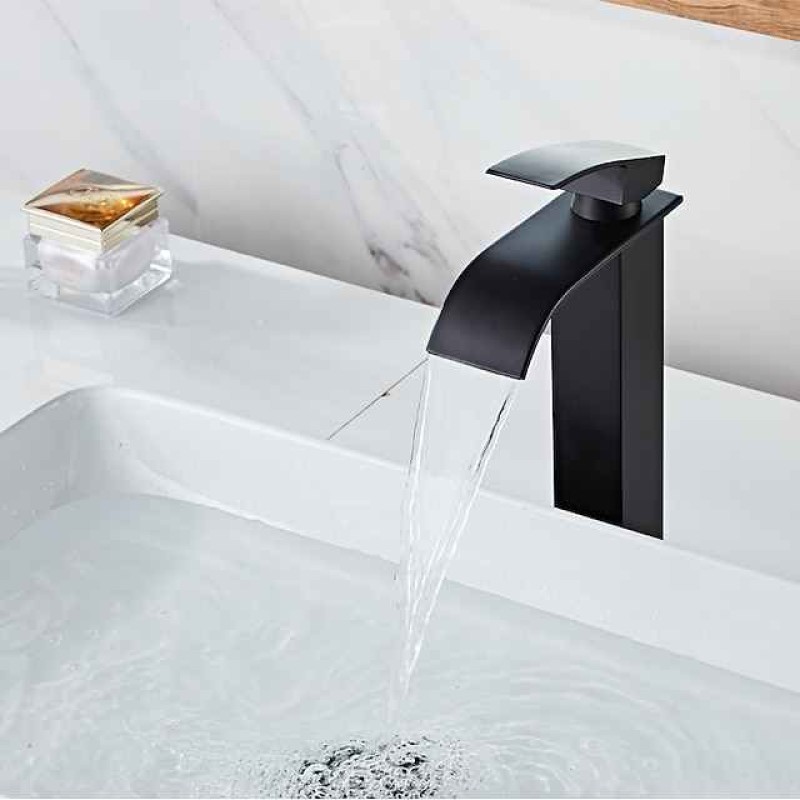 Waterfall Bathroom Sink Mixer Faucet Tall Short, Mono Wash Basin Single Handle Basin Taps, Washroom with Hot and Cold Hose Monobloc Vessel Water Brass Tap Deck Mounted Golden Black